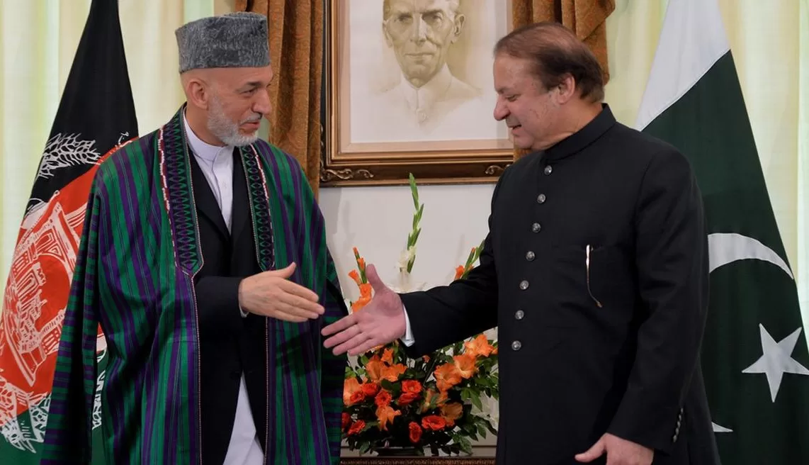 Afghan President Hamid Karzai, shakes hand with Prime Minister Nawaz Sharif prior to their meeting in meeting in Islamabad.